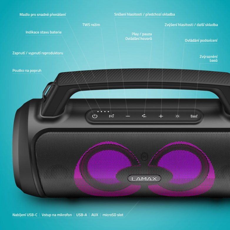 Rozjeď kdekoliv i neplánovanou party ve velkém stylu. Přenosný party reproduktor LAMAX PartyGo1 je vzhledem malý, ale ukrývá v sobě velkou sílu, výkon 100 W. Technologie BeatBass® mu dává silný, plný a bohatý zvuk. Grilovačku, narozeninovou oslavu nebo menší party oživí 3 režimy LED podsvícení a možnost připojení mikrofonu, když si chceš užít karaoke nebo akci moderovat. Reprák se automaticky spáruje s jakýmkoliv zařízením prostřednictvím Bluetooth 5.3, který poskytuje bezchybný přenos až na 18 m. Na pohodu s tebou bude nový parťák i cestovat, baterie mu vydrží až 20 hodin a má navíc šikovné madlo nebo popruh přes rameno. Připojíš ho jak přes BT, tak USB, microSD, případně AUX a umí se proměnit taky v powerbanku přes USB-A vstup. A když jeden reprák nestačí, můžeš ho spárovat s druhým.