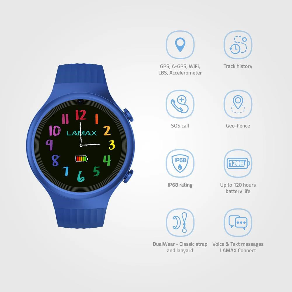 Dětské GPS hodinky, hlasové a textové zprávy, videohovory, určování polohy PinPoint®, bezpečnostní zóny, DualWear®, SOS tlačítko, funkce FriendsConnect® - propojení až 60 kamarádů, propojení všech členů rodiny díky FamilyCareConnect®, aplikace LAMAX Connect v češtině, šifrované spojení, výdrž až 120 hodin, krokoměr, připomínky, voděodolné, 1,2'' barevný dotykový displej s Gorilla Glass, SIM karta 200MB v balení