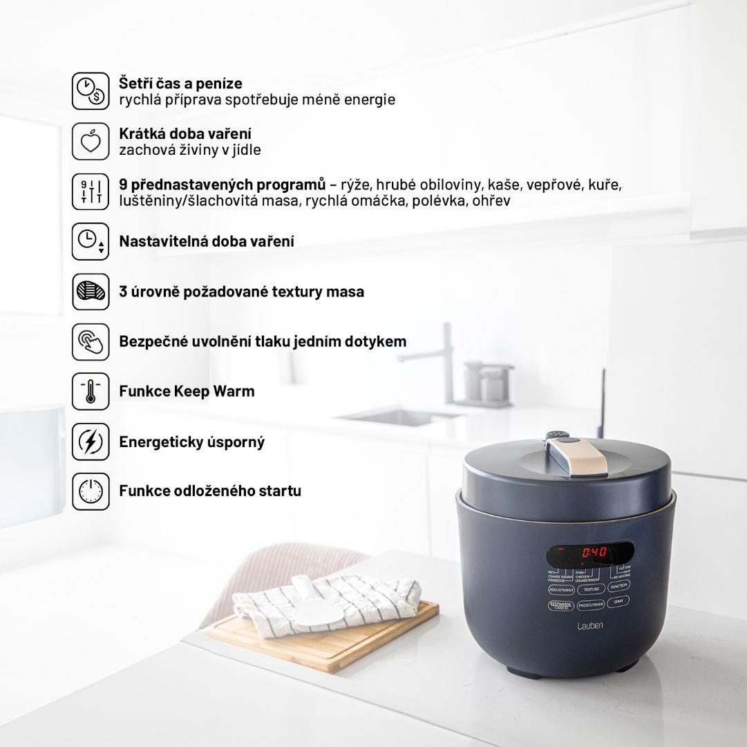 Tlakové hrnce bývaly vždy vítanými, avšak obávanými společníky v domácnosti. Energeticky úsporný víceúčelový elektrický tlakový hrnec Lauben Electric Pressure Cooker 5000AT má všechny výhody tzv. papiňáku a ještě víc, jen v moderním a bezpečném hávu. Čas i peníze šetří kratší dobou přípravy díky tlaku uvnitř, navíc takto se zachová v jídle více živin. I když nejste kuchařský mistr, oblíbíte si fakt, že do hrnce stačí dát suroviny, zapnout a on se už postará. Hrnec disponuje 9 přednastavenými programy a 3 úrovněmi požadované struktury masa. Čas přípravy ovlivníte i manuálně. 5l objem stačí pro celou rodinu, údržba je snadná, bezpečnost zajišťuje One Touch ventil pro upuštění tlaku. Jídlo udrží teplé funkce Keep Warm, lepší plánování umožní odložený start. Balení obsahuje též kuchařku.