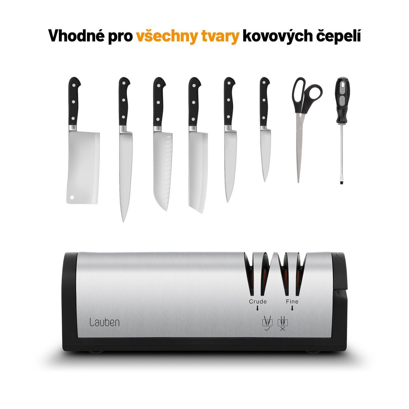 Bruska se hodí pro broušení většiny nožů, nůžek a sekáčků v domácnosti.