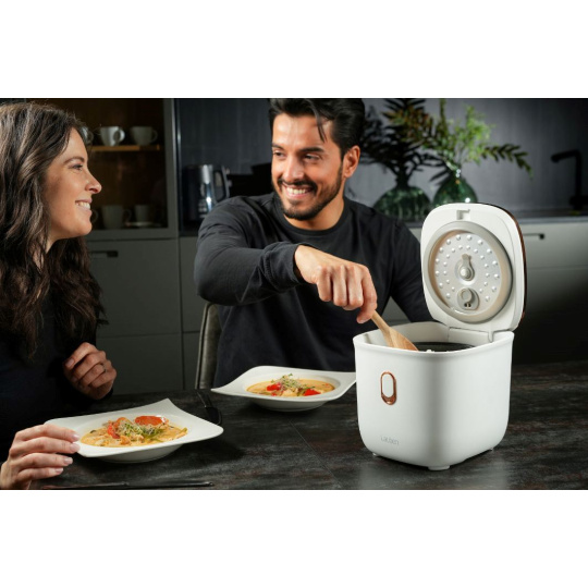 Vařte s lehkostí, chutně a stylověEfektivita, snadné použití a design mají společného jmenovatele, je jím víceúčelový rýžovar Lauben Multifunction Rice Cooker 1200WR Rose Gold Edition. Stiskem jediného tlačítka uvaří všechny druhy rýže na správnou tvrdost a 6 přednastavených funkcí vykouzlí další pokrmy jako kaše nebo polévky. Čas některých programů si však na intuitivním dotykovém displeji můžete nastavit i manuálně. Díky funkci odloženého startu lze mít jídlo připraveno už po návratu domů, opozdilci zase ocení funkci Keep Warm, která udrží pokrm teplý bez rozvaření. Porce nasytí jednotlivce i páry, jež pak mají více času pro sebe, protože ani údržba nezabere čas. Vnitřní hrnec lze dát do myčky. Bezpečné používání zajišťuje ochrana proti přetečení a technologie Cool Touch proti popálení. Rýžovar bude ozdobou každé kuchyně, kterou rozzáří trendy rose gold barvou, a přitom nezabere takřka žádné místo.