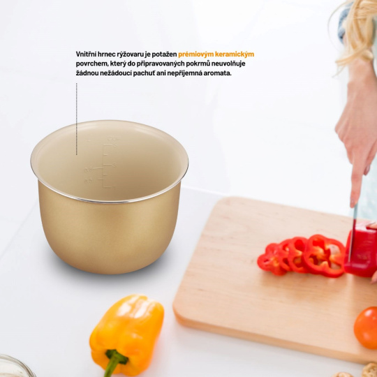 Dopřejte si více času na jiné aktivity a vaření přenechte multifunkčnímu rýžovaru, jehož 9 přednastavených programů si poradí s přípravou nejrůznějších pokrmů. Programy jako rýže, hnědá rýže, polévka, kaše, dort, jogurt, kari, vaření v páře, či ohřev jsou zárukou snadného a rychlého vaření. Prémiový keramický povrch vnitřního hrnce navíc neuvolňuje žádnou nežádoucí pachuť ani aroma, příprava pokrmů je tak zdravější. Pokud chcete svůj životní styl ještě vylepšit, využijte nerezového pařáčku pro dušení v páře. Pařáček je navhrnutý tak, že šťávy z připravovaného jídla nekapou do rýže připravované pod ním.