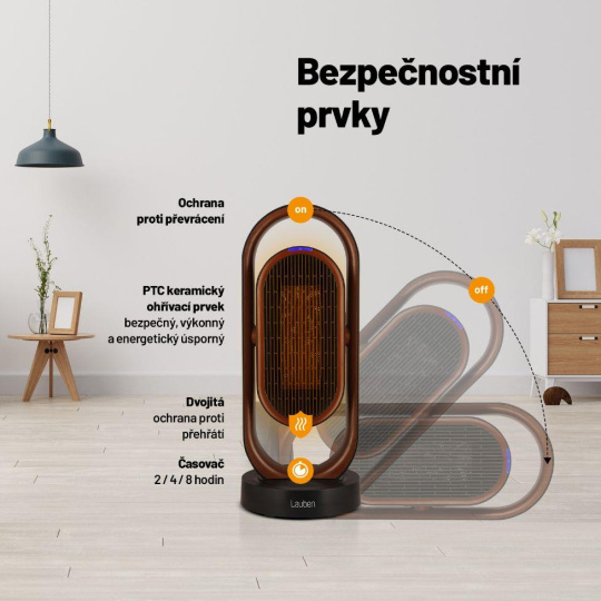 Dokonalý high end Lauben design se vyjímá v každém prostoru a 20 m2 dokonale ovládne i díky širokému úhlu záběru, kdy se do stran pohybuje až v úhlu 80° a nahoru/dolů v úhlu 45°. Nejen funkčnost a design jsou však důležité, na prvním místě stojí bezpečnost. Tu zajišťuje dvojitá pojistka proti přehřátí a pojistka proti převrhnutí, které v krizové situaci přístroj vypnou.