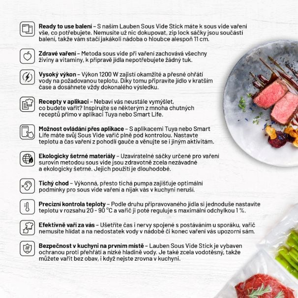 Díky speciální metodě sous vide, která je založena na přípravě jídel při nižších teplotách ve vakuu, si všechny pokrmy zachovají svůj původní tvar a barvu. S Lauben Smart Sous Vide se vám nikdy nestane, že byste jídlo připálili, rozvařili nebo zkazili. Čerstvost a všechny chutě i vůně v ingrediencích zůstanou. I proto tuto metodu využívají šéfkuchaři v michelinských restauracích. Vy si můžete takto uvařit i doma, příprava vám nezabere téměř žádný čas a vařič vše ohlídá za vás.