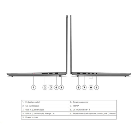 | Standartné porty | 1x USB-A (USB 5Gbps / USB 3.2 Gen 1) 1x USB-A (USB 5Gbps / USB 3.2 Gen 1), Always On 2x USB-C® (Thunderbolt™ 4 / USB4® 40Gbps), with USB PD 65-100W and DisplayPort™ 2.1 1x HDMI® 2.1, up to 8K/60Hz 1x Headphone / microphone combo jack (3.5mm) 1x SD card reader 1x Power connector |