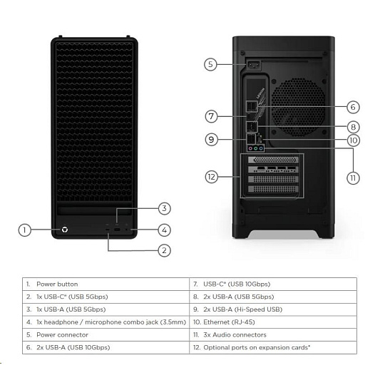 | Zadné porty | 1x USB-C® (USB 10Gbps / USB 3.2 Gen 2) 2x USB-A (Hi-Speed USB / USB 2.0) 2x USB-A (USB 10Gbps / USB 3.2 Gen 2) 2x USB-A (USB 5Gbps / USB 3.2 Gen 1) 1x Ethernet (2.5GbE RJ-45) 1x power connector 3x audio out (5.1 channel) |