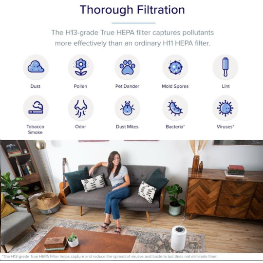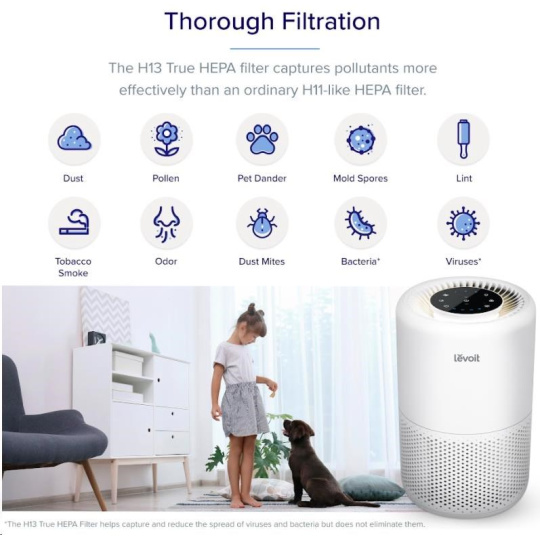 Druhou vrstvou je HEPA filtr H13. To odlišuje Levoit od konkurence, protože filtr HEPA H13 je mnohem kvalitnější a spolehlivější než běžně používané HEPA H11. Tu se odfiltrují jemné prachové částice, plíseň, bakterie, pyl, kouřové částice, roztoče a srst.