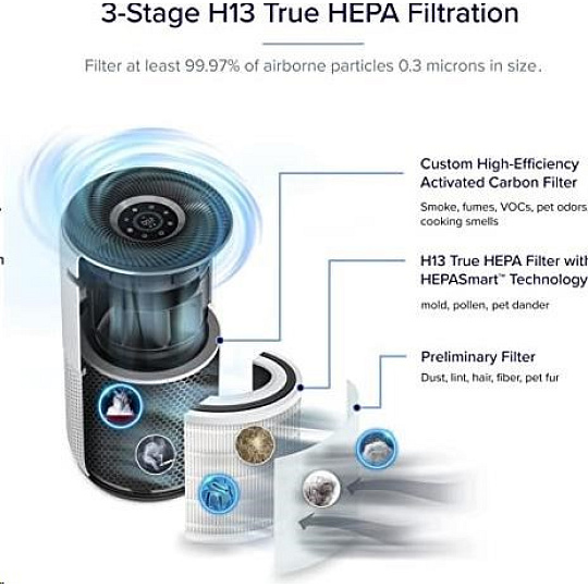 Druhou vrstvou je HEPA filtr H13. To odlišuje Levoit od konkurence, protože filtr HEPA H13 je mnohem kvalitnější a spolehlivější než běžně používané HEPA H11. Tu se odfiltrují jemné prachové částice, plíseň, bakterie, pyl, kouřové částice, roztoče a srst.