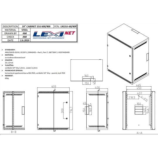 | Povrchová úprava: | komaxitová vypalovaná barva RAL7035 - šedá vertikální 19" lišty - pozink |