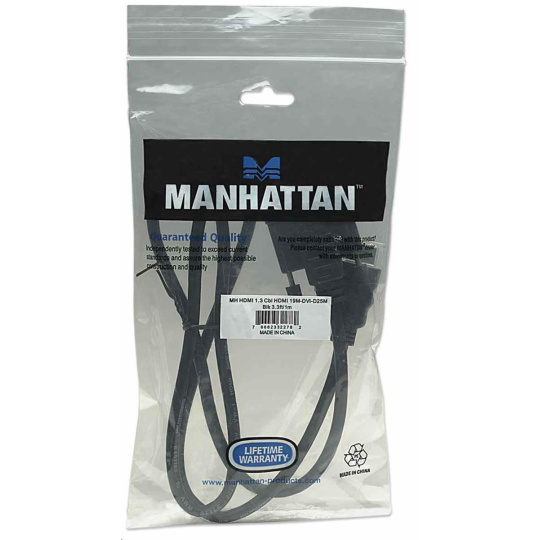 The Manhattan HDMI to DVI-D Cable delivers the brightest, most accurate colors and sharpest detail when connecting a high-definition television, LCD or plasma display, digital satellite receiver, DVD player, digital projector or other DVI- or HDMI-equipped display devices. Manhattan HDMI to DVI-D Cable is engineered and constructed of quality materials to deliver dependable transmissions in digital video applications. Full foil and braided shielding, molded boots with strain relief, protective PVC jackets and gold-plated connections help provide maximum conductivity and clear, crisp signal transmissions with reduced EMI interference and distortion.