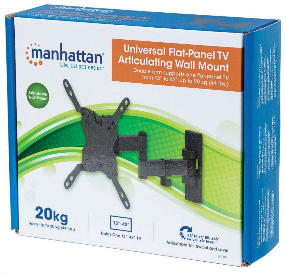 Overcome an odd floor plan, annoying glare or awkward furniture placement that can limit the enjoyment of your flat-panel TV. The Manhattan Universal Flat-Panel TV Articulating Wall Mount folds nearly flat against the wall and safely extends on a strong, double-jointed arm to help you achieve prime viewing positions from almost anywhere in the room. VESA-compliant and constructed of quality materials, this articulating wall mount fits a range of display sizes for a secure and confident above-the-floor TV installation. It's the perfect fit for mounting a TV in your living room, bedroom or den, as well as for commercial uses in hotels, classrooms, conference rooms, for digital signage and more. Wherever you install it, the Manhattan Universal Flat-Panel TV Articulating Wall Mount puts the best TV viewing experience front and center.