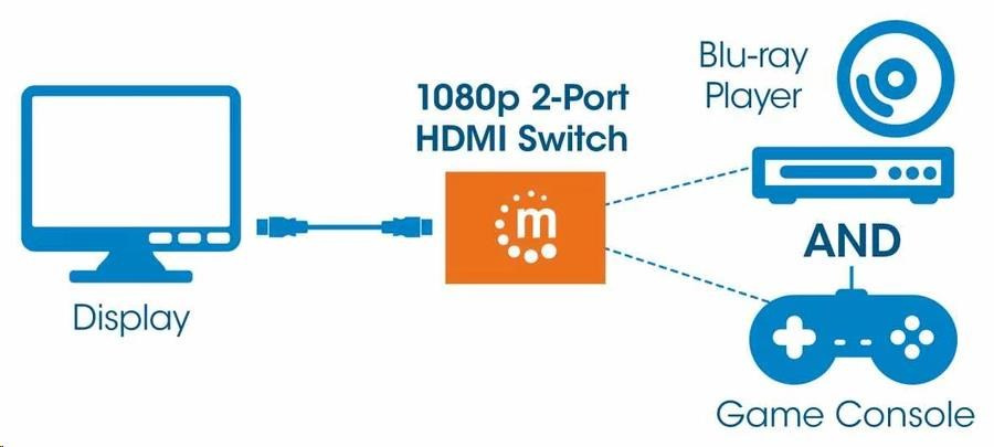 Easily connect multiple HDMI sources to a single display.The Manhattan 1080p 2-Port HDMI Switch connects two HDMI video sources — including gaming consoles, Blu-ray players, satellite receivers, digital recorders, set-top boxes and other devices — to a single high-definition display.Flexible Solution for Many HD ApplicationsWith the increased number of high-definition media devices available, the Manhattan 1080p 2-Port HDMI Switch expands the connectivity options for your HDTV, flat-panel display monitor or video projector. The switch automatically detects and selects the active HDMI source and routes the signal to your display. Additionally, its manual selection button allows users to select sources when more than one HD video source is on at the same time.Best Possible Image QualityFull compliance with HDMI and HDCP 1.0 and 1.1 ensures that the Manhattan 1080p 2-Port HDMI Switch provides high-quality performance and reliability. It delivers full 1080p resolution images and supports 3D video as well as LPCM, DTS and Dolby TrueHD audio.