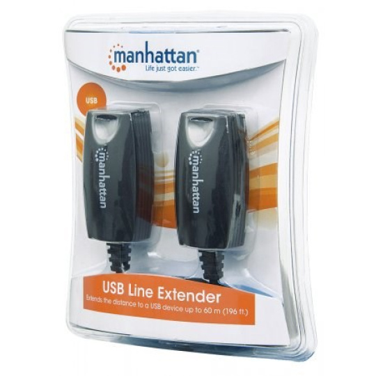Use the Manhattan USB Line Extender to overcome the USB distance restriction and expand device and PC locations and better organize productive office arrangements. The Manhattan USB Line Extender can help extend a USB keyboard and mouse during presentations, operate a barcode scanner in retail point-of-purchase applications, access a printer in another room and improve other USB applications without signal loss or interference.