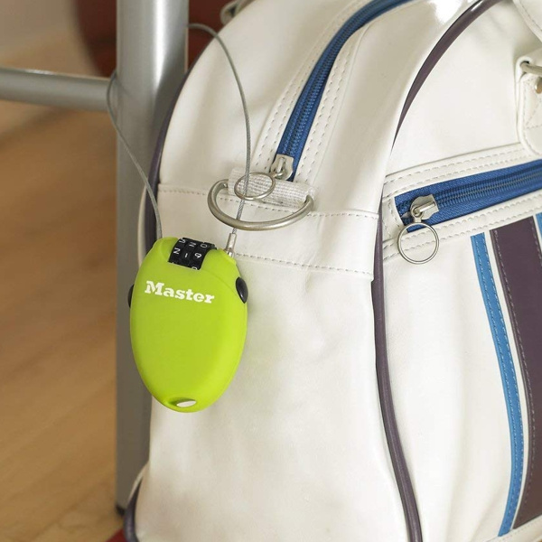 Zatahovací kabelový zámek o délce 70 cm a průměru 2 mm pro pevnost a flexibilitu; ochranný vinylový potah chrání proti poškrábání; lehce stahovatelný ocelový pletený kabel; tlačítkový mechanismus umožňuje snadné zpětné uložení; měkký dotykový kryt pro protiskluzovou rukojeť; obsahuje 3-místnou resetovatelnou kombinaci zámku; doporučeno pro ochranu zavazadel, sedadel a helem.
