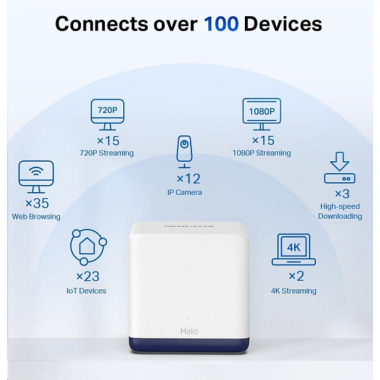 V porovnání s běžným samostatným routerem, který má omezený dosah do vzdálených koutů domu, funguje Halo H50G jako jednotný systém, který zaručuje rychlý a stabilní signál Wi-Fi v celém domě, pokrývá až 6 000 ft2 (550 m2) a eliminuje mrtvé zóny Wi-Fi. Užívejte si bezproblémové Wi-Fi připojení s technologií Mesh od vchodových dveří až po dvorek.
