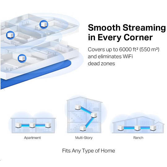 - Pokrytí celé domácnosti – pokrytí prostoru až 6 000 ft2 (550 m2) vysokorychlostní sítí Wi-Fi, eliminující mrtvé zóny Wi-Fi ve vaší domácnosti.