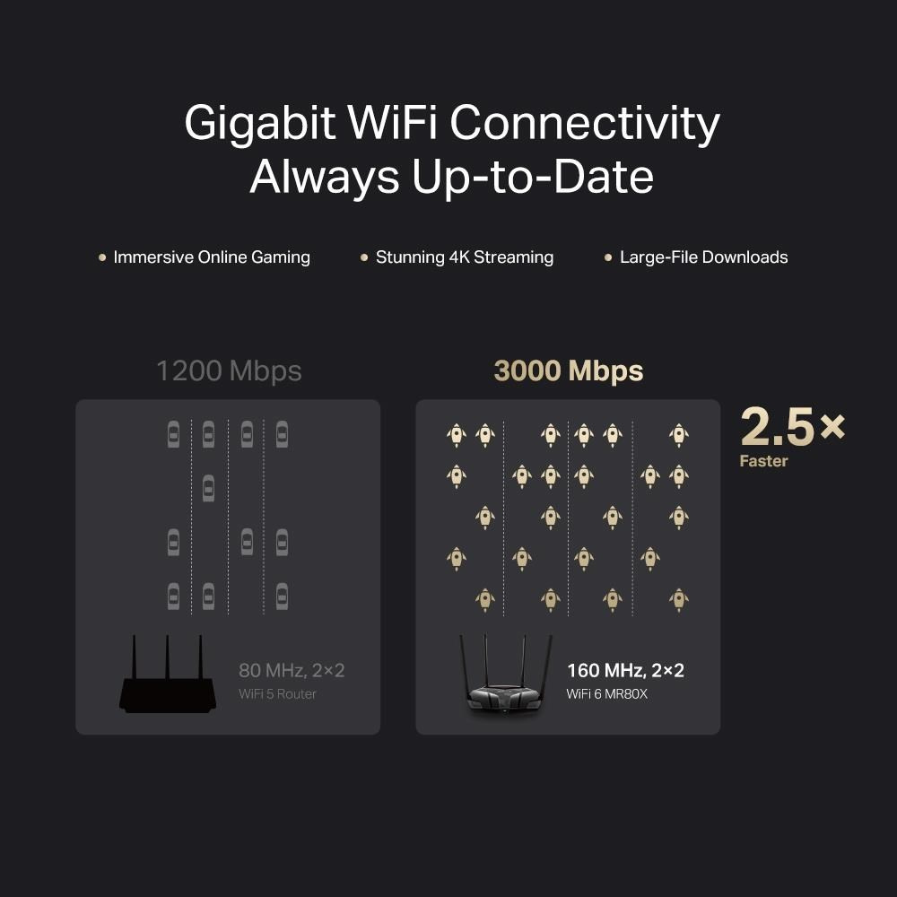| Package Contents | • AX3000 Wi-Fi 6 Router MR80X • Power Adapter • Quick Installation Guide • RJ45 Ethernet Cable |