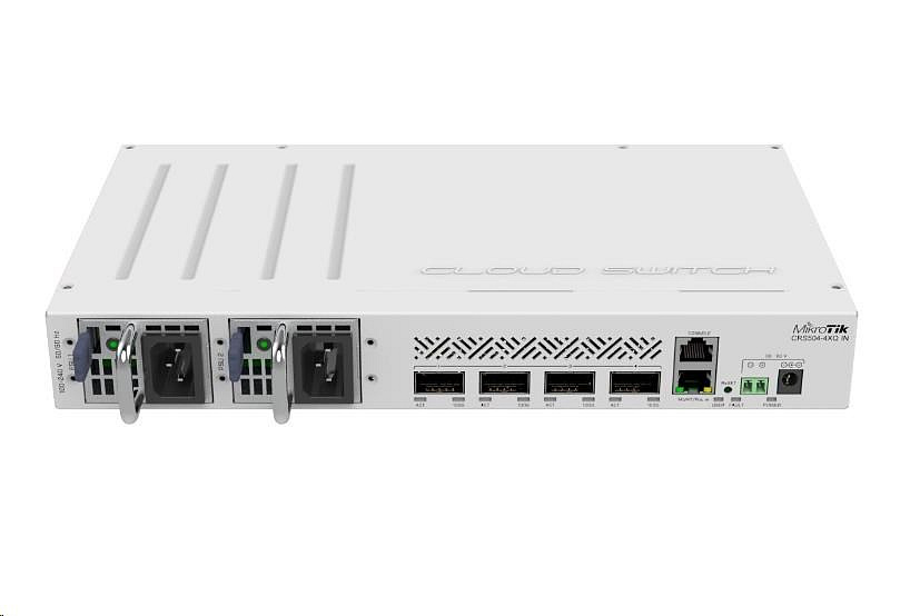 Optický Cloud Router Switch CRS504-4XQ-IN je vhodné řešení pro montáž do 19" racku pro přístup k sítím 100 Gb/s a jako malý centrální optický přepínač, který nabízí4x QSFP28s rychlostí 100 Gbps,1x Ethernet ports podporou pasivního napájení PoE a konzolovým portem RJ45. Switch lze napájet přes dva redundantní hot-swap zdroje, DC konektor/DC svorkovnici (36 - 57V DC), stejně jako přes ethernetový port podporující pasivní PoE s napětím 43 - 57V DC. Maximální příkon zařízení je 41 W.