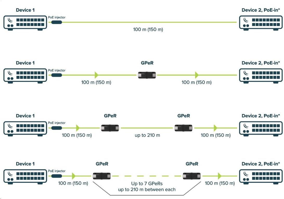 Gigabitový pasivní ethernetový repeater GPeR umožňuje prodloužit celkovou délku kabelu mezi začátkem a koncem až na vzdálenost 1500m! (při použití 7 kusů GPeR) Vhodné pro výškové budovy, vícebytové budovy, s mnoha podlažími a sekcemi, kde by mohly být velmi dlouhé kabely Ethernet.