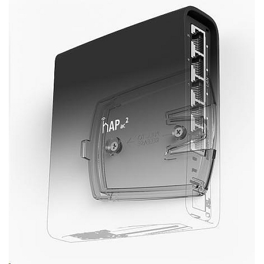 hAP ac2 je nový výkonný router podporující standard 802.11b/g/n/ac. Je integrována jak 2.4GHz tak 5GHz Wi-Fi, dual-chain anténa 2.5dBi, max.výkon 27dBm pro 2.4GHz a 26dBm pro 5GHz. Čtyřjádrový procesor je taktován na 716MHz a sekunduje mu 128MB RAM operační paměti typu DDR. K dispozici je celkem pět ethernetových portů 1000Mbps s podporou PoE in(port1).