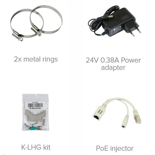 Balení obsahuje: 3x RBLHG-5nD, PoE injektor, napájecí zdroj, montážní sada na stožár