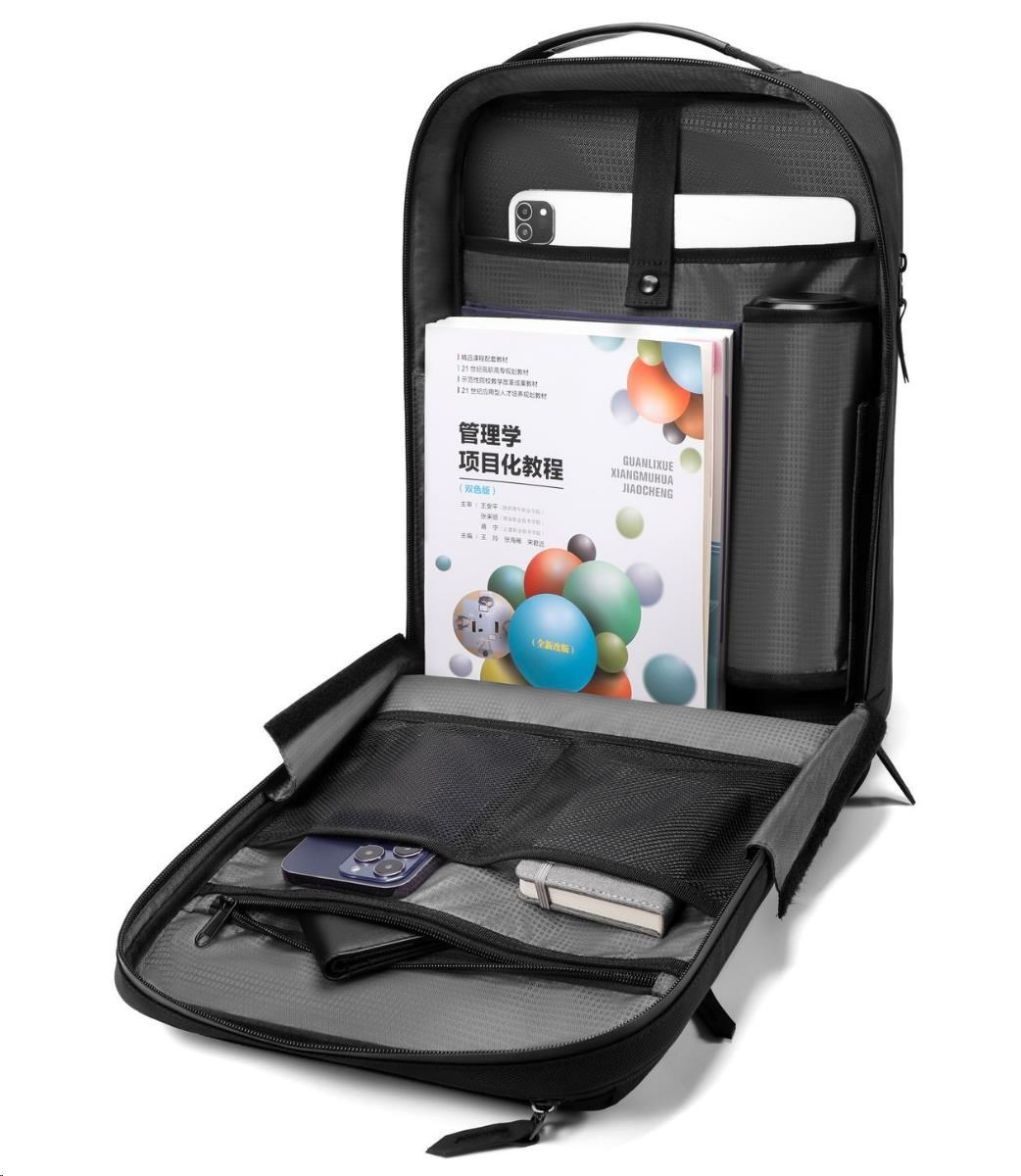 Hlavní kapsa batohu je přehledně členěna do vnitřních kapes a přihrádek. Dále je vám k dispozici velká zadní kapsa, dvě přední kapsy, skrytá kapsa a kapsa na láhev.
