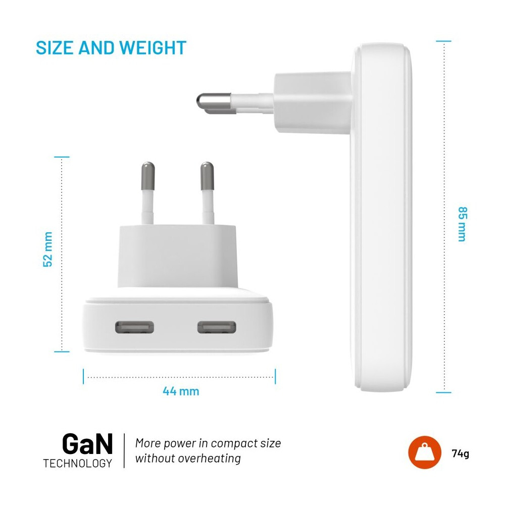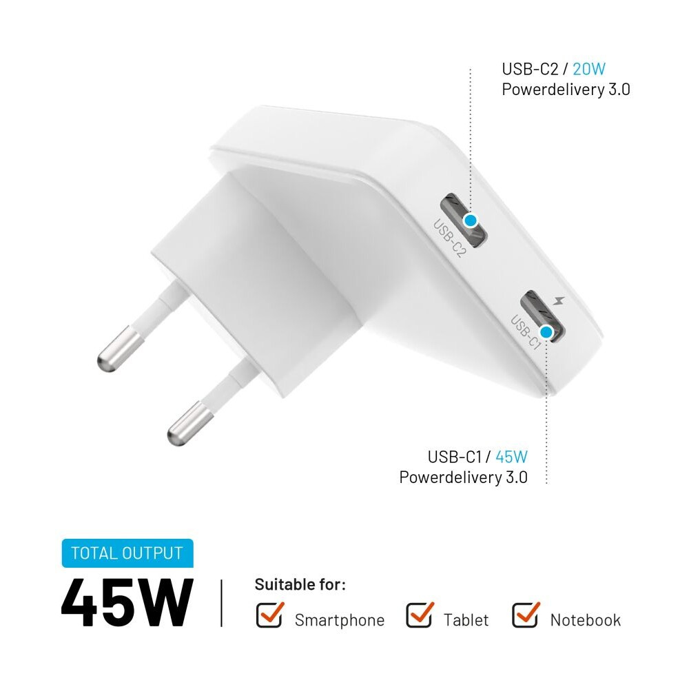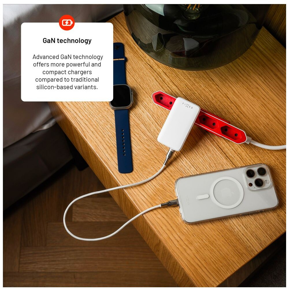 FIXED Slim GaN nabíječka (2x USB-C), PD, 45W, bílá