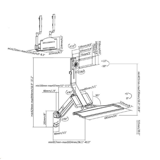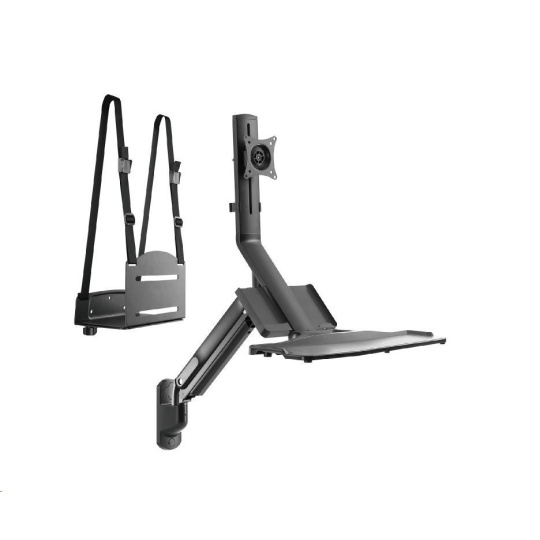 Nástěnná pracovní stanice monitor, klávesnice, PC Fiber Mounts M8C38     Kompletní pracovní stanice, držák monitoru 17-32", klávesnice a PC Toweru     Kvalitní nástěnný systém pro vytvoření pracovní nebo informační stanice - 3D polohovatelný držák na monitory 17-32" včetně poličky na klávesnici i s myší + univerzální nástěnný držák na PC Tower. Plná polohovatelnost držáku monitoru s policí - otáčení, naklápění, výškové polohování, rotace monitoru, korekce roviny, možnost zaklopení police. Police na klávesnici (a myš) má rozměr 660 x 220mm, možnost naklopení nebo zaklopení. Na držáku je i přihrádka na vizitky, katalogy apod. Nástěnný držák na PC Tower má nosnost 15kg. Barevné provedení černé. Záruka 3 roky.     Plnohodnotná nástěnná pracovní stanice na monitor, klávesnici s myší a PC Tower, plně polohovatelné, TOP kvalita - Fiber Mounts M8C38     Technické údaje:   maximální hmotnost monitoru 9kg maximální hmotnost PC Toweru 15kg velikost monitoru 17" až 32" držák monitoru podporuje VESA 75x75 a 100x100 kompletní polohovatelnost držáku monitoru s policí otáčení do stran, naklápění, nastavení výšky a vzdálenosti od zdi výškové polohování až o 515mm funkce pivot držáku monitoru police na klávesnici o rozměrech 660x220mm možnost náklonu až 5°, možnost zaklopení k monitoru nástěnný držák na PC Tower včetně popruhů instalační materiál systém vedení kabeláže barevné provedení černé záruka 3 roky.