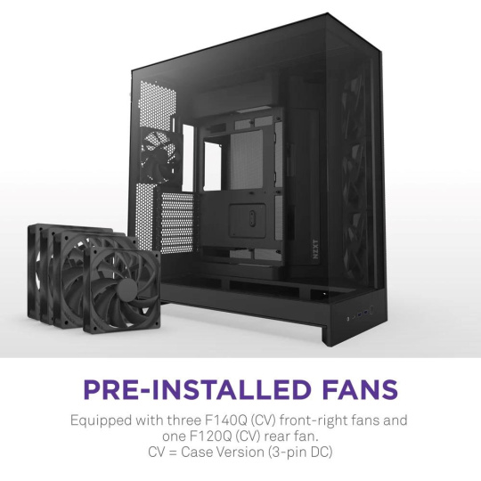- Předinstalované ventilátory: Obsahuje tři ventilátory F140Q (CV) v pravé přední části a jeden ventilátor F120Q (CV) v zadní části. CV = verze pro skříň (3-pin DC)
