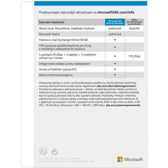 Předplatné sady aplikací a služeb Microsoft 365 Business Standart obsahuje prémiové kancelářské aplikace Word, Excel, PowerPoint, Outlook, OneNote, Access (pouze PC), Publisher (pouze PC), Teams, Exchange, SharePoint a prvotřídní firemní služby spolu s funkcemi pro zabezpečení a dodržování předpisů. Součástí je také přístup na cloudové úložiště OneDrive s kapacitou 1 TB a nechybí ani funkce Osobní trezor a rozšířené možnosti zabezpečení. Funguje v systémech Windows, Mac, iPadOS, iOS a Android. Elektronická licence doručená emailem na 1 rok pro 1 uživatele na 5 počítačích, 5 mobilních zařízeních a 5 noteboocích.