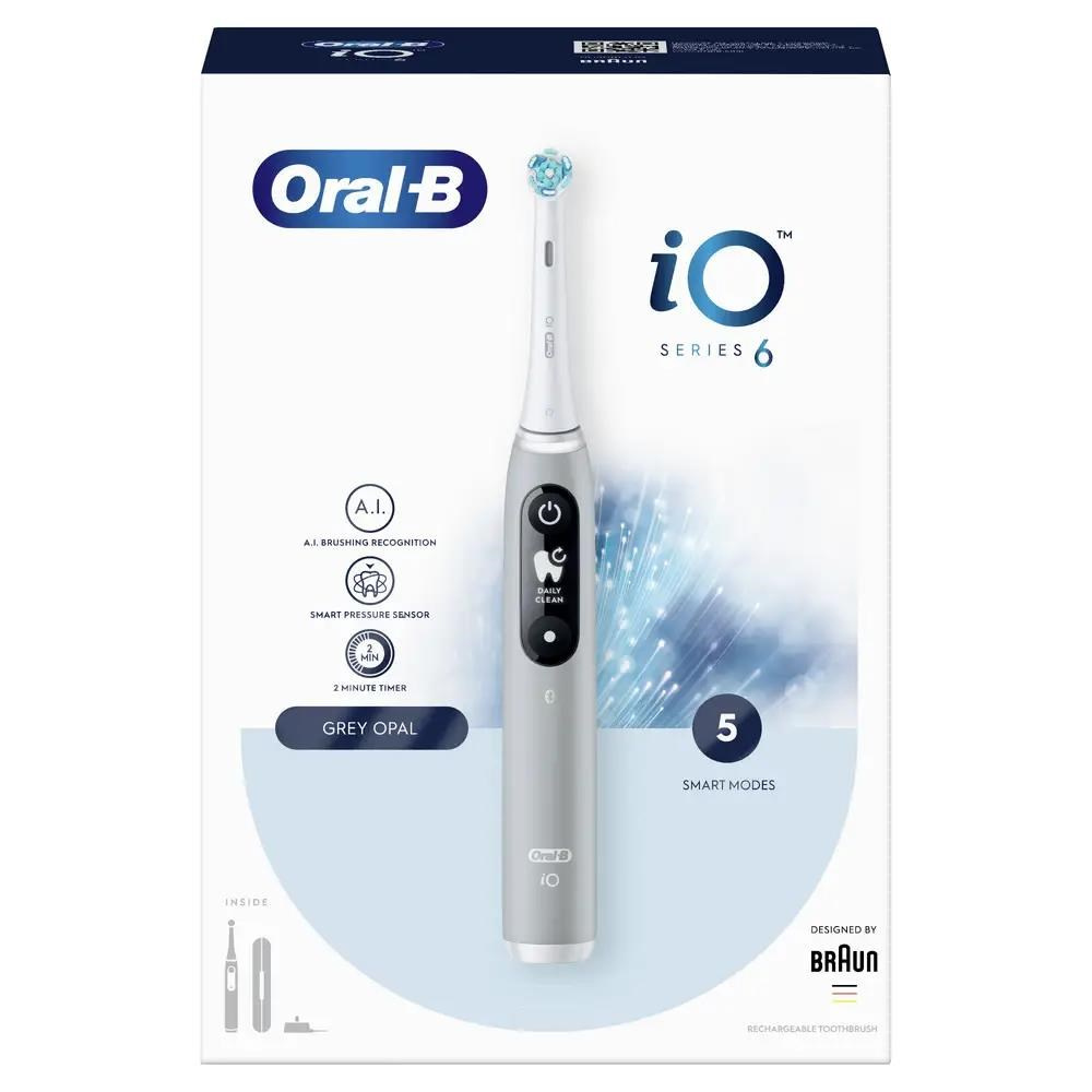 Oral-B iO Series 6 Grey Opal elektrický zubní kartáček, magnetický, 5 režimů, tlakový senzor, AI, pouzdro