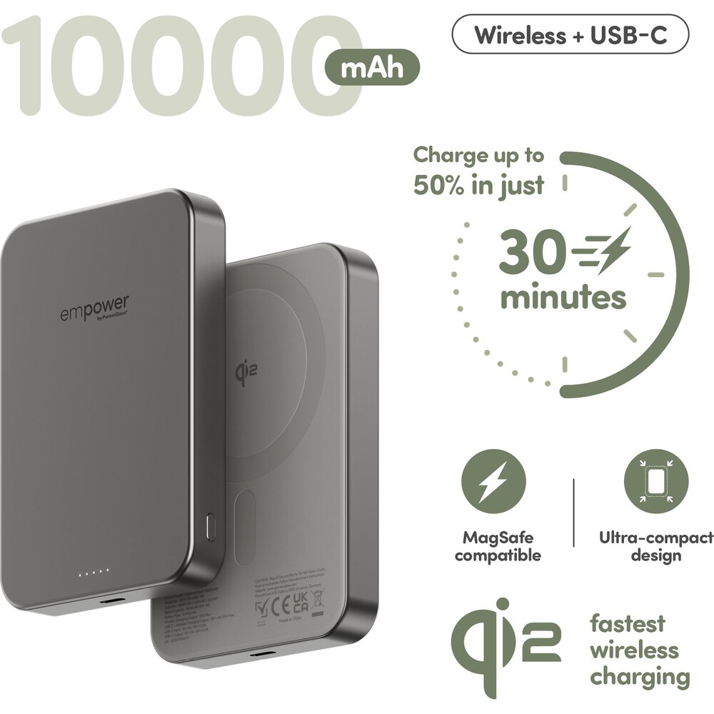 PanzerGlass® empower bezdrátová Qi2 powerbanka 10000 mAh, MagSafe, šedá