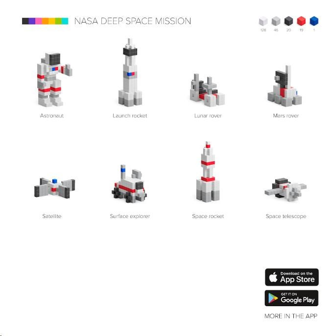 Stavebnice PIXIO 31101 NASA Deep Space Mission (Vesmírná mise) obsahuje 214 bloků PIXIO v 5 barvách. Umožní oživit vaše kreativní nápady a přinesou barevnou radost do života. Začněte tavbou jednoduchých modelů podle pokynů a poté, až budete připraveni, přejděte k vytváření vlastních návrhů. S touto sadou postavíte astronauta, lunární vozítko, raketu, družici, teleskop a mnoho dalších. Pixio je splněný sen pro fanoušky Pixel Art, hráče Minecraftu a všechny, kdo si prostě rádi hrají. Použijte jej jako učební zdroj pro rozvoj kreativity dětí. Obsahuje 5 barev, které vám pomohou přeměnit jednoduché tvary na skvělé objekty a postavy (bílá 128x, šedá 46x, černá 20x, červená 19x, modrá 1x).