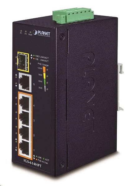 Planet IGS-614HPT, PoE switch, 5x 1000Base-T, 1x SFP, 4x PoE 802.3at, -40~+75°C, 12-56VDC, dual-power, DIN