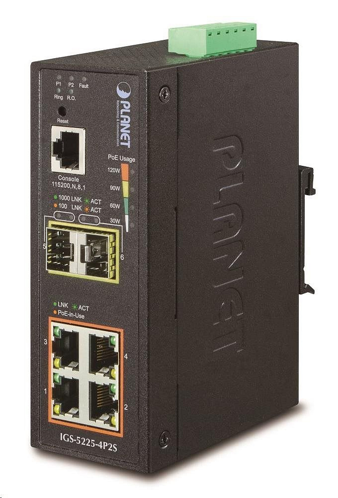 Planet switch IGS-5225-4P2S, průmyslový 4x10/100/1000T, 2x100/1000X SFP, -40~+75°C, PoE