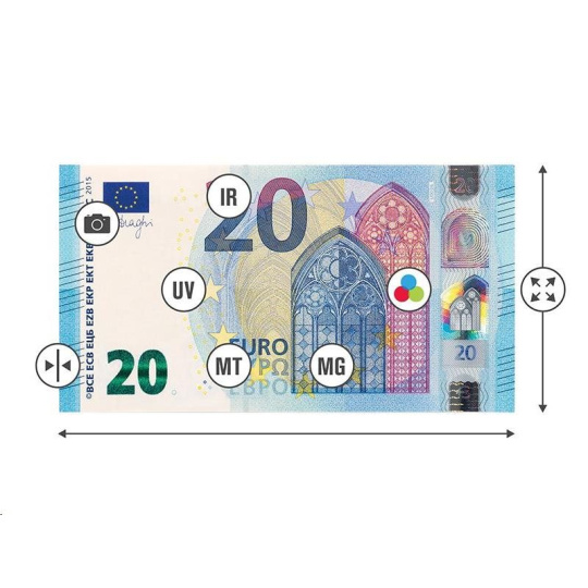 - 7-bodová detekce padělků: prvky viditelné v ultrafialovém světle, magnetický inkoust, kovový proužek, infračervené vlastnosti, obraz, velikost a tloušťka