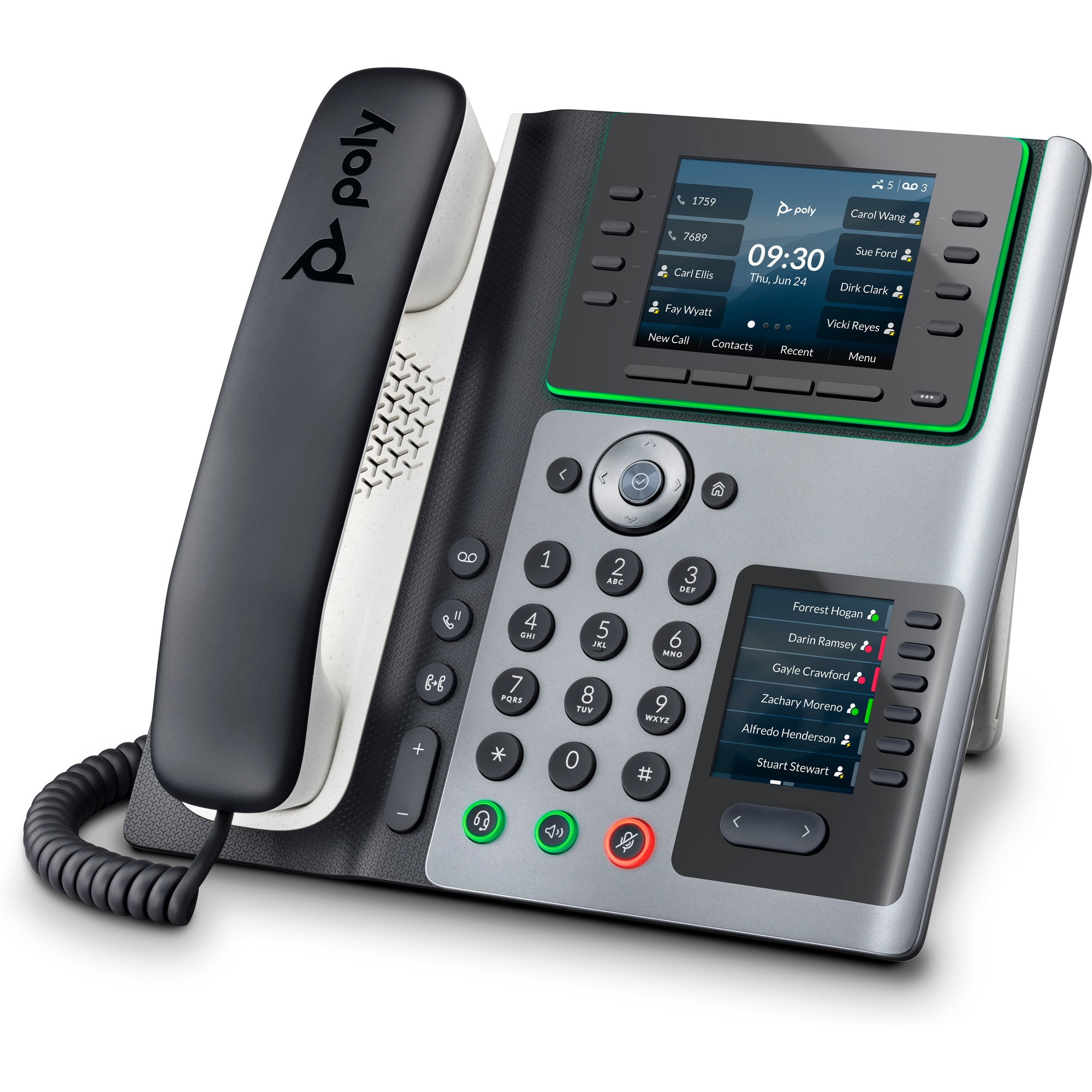 AudioPoly HD Voice; Technologie Poly Acoustic Clarity zajišťuje plně duplexní hovory a potlačuje akustickou ozvěnu i okolní šum; Technologie Poly Acoustic Fence potlačuje okolní hluk při použití sluchátka nebo kabelové náhlavní soupravy; Technologie Poly NoiseBlockAI odstraňuje většinu okolního hluku při používání konferenčního reproduktoru; Aplikace Poly Computer Audio Connector nainstalovaná v počítači (pouze Windows) umožňuje vybrat telefon pro zvukový vstup a výstup počítače a použít s počítačovými aplikacemi sluchátka, volitelné náhlavní soupravy a handsfree hlasitého odposlechu; Design s vylepšenými basy; Širokopásmový zvuk TIA-920, v souladu s typem 1 (plně duplexní IEEE 1329); Individuální nastavení hlasitosti s vizuální zpětnou vazbou pro každou zvukovou cestu; Detekce hlasové aktivity; Komfortní tvorba hluku; Generování tónů DTMF (RFC 2833 a v pásmu); Přenos zvukových paketů s nízkým zpožděním; Adaptivní paměti pro vyrovnání zpoždění