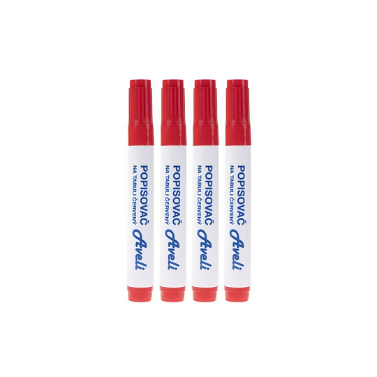 Popisovače na tabule a flipcharty AVELI. Sada 4 červených popisovačů. Netoxický Šíře stopy 4 mm Kuželový hrot Snadno stíratelný Odolný proti vyschnutí.