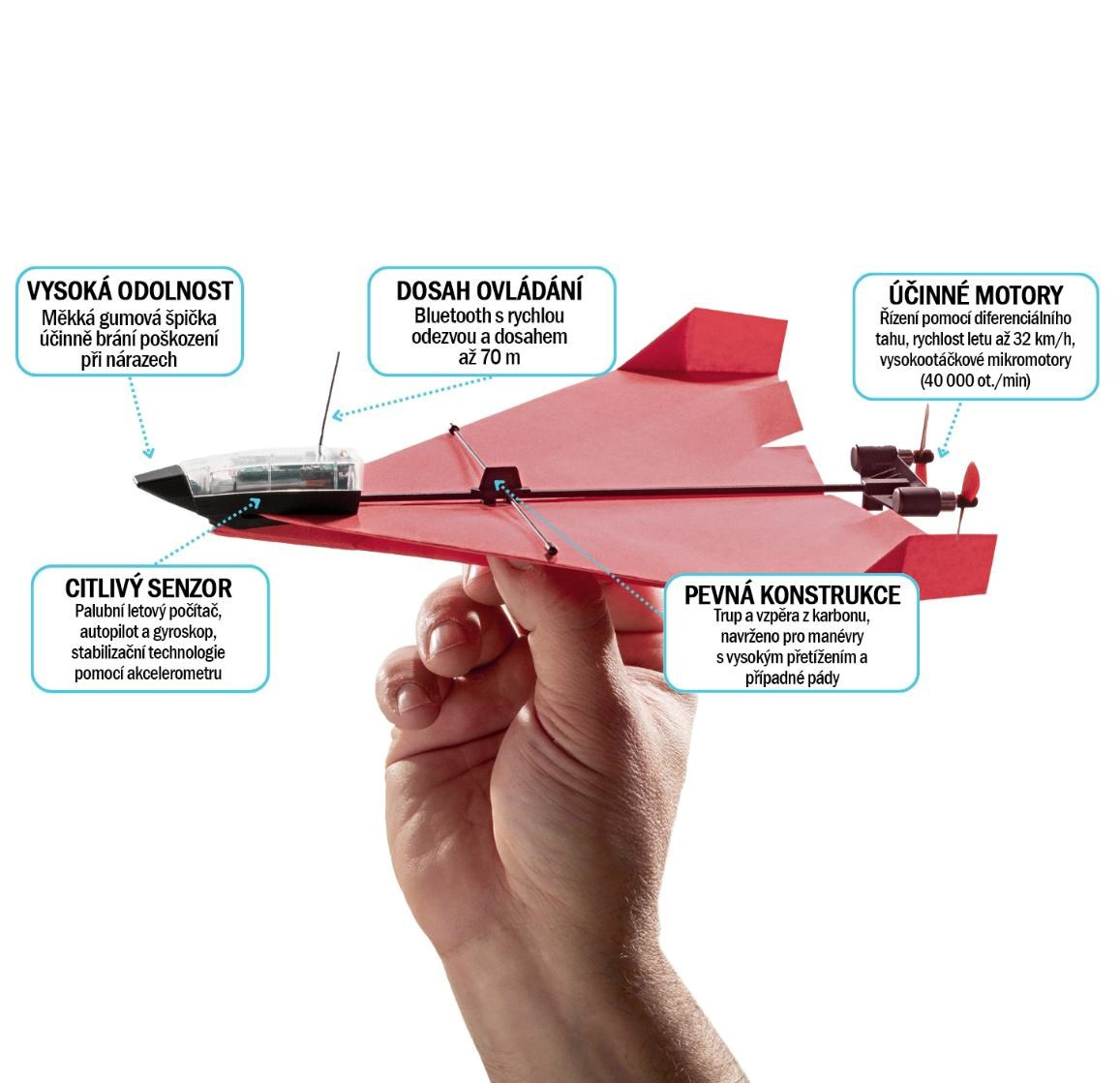- Bezpečí při ztrátě signálu: Pokud s letadlem omylem vyletíte mimo 70m dosah, palubní systém ztratí komunikaci s telefonem, automaticky vypne motory a vlaštovka sama bezpečně doklouže na zem.