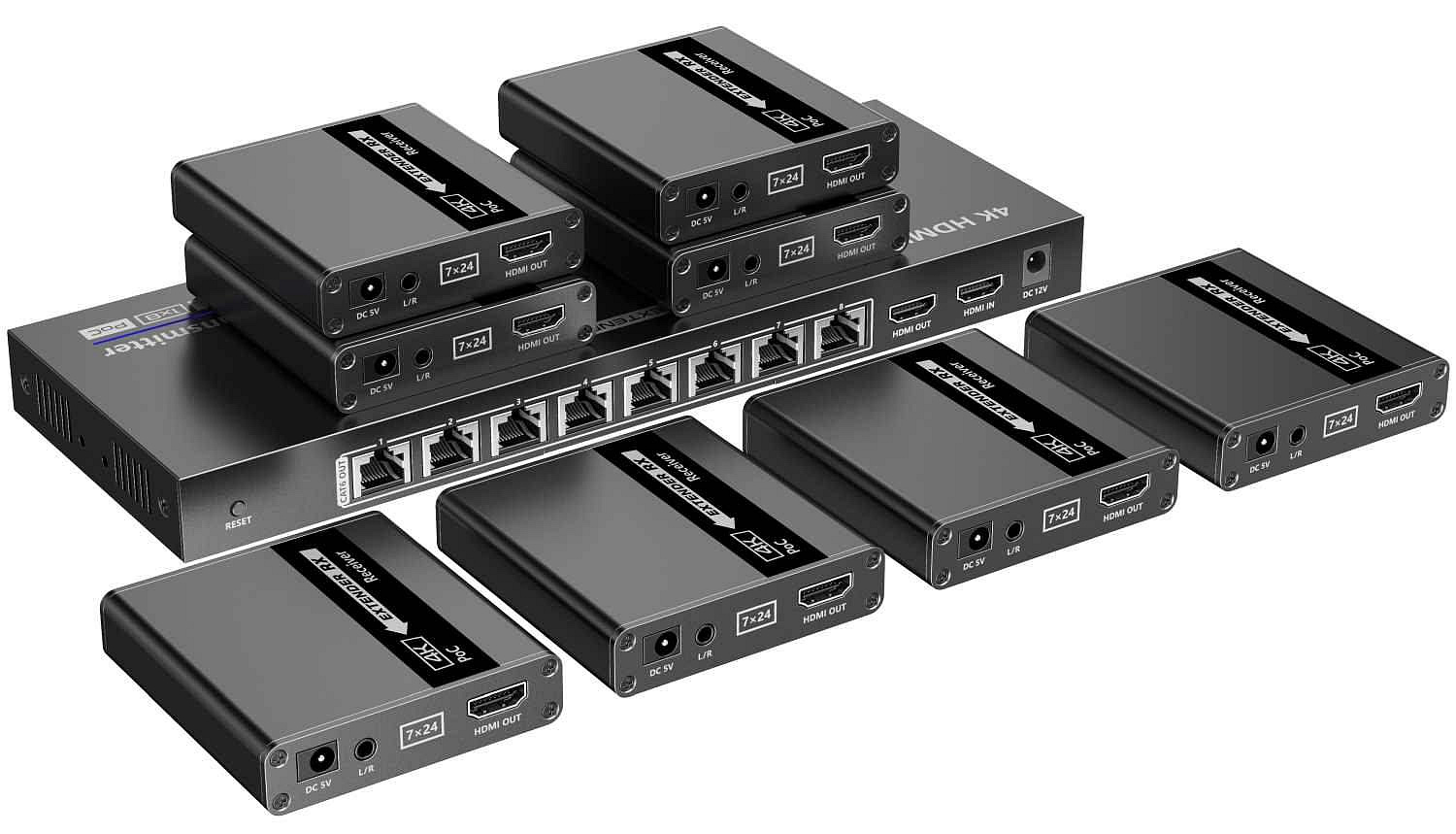 Extender se skládá z jedné vysílací jednotky s lokálním výstupem HDMI a dvou přijímačů, které se propojí CAT6/6a/7 kabelem s vysílačem.