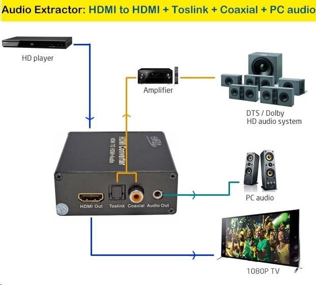 Umožní oddělit audio z HDMI vstupu na analogové / digitální audio, které je vyvedeno zvlášť na konektory: stereo jack, Digitální audio RCA CINCH nebo digitální optické TOSLINK