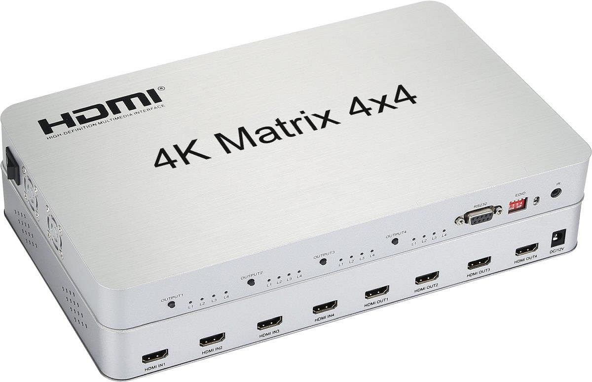 HDMI matrix switch 4:4, umožní propojit až čtyři zdroje signálu HDMI na 4 výstupy HDMI, umožní zapojit například PC+DVD přehrávač+BlueRay k jednomu vybranému monitoru ze čtyřech.