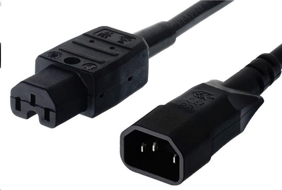 Kabel síťový prodlužovací, IEC320 C14 - C15, 2m Prodlužovací napájecí kabel zakončený speciálním konektorem s drážkou IEC 320-C15. První konektor: IEC 320 C15 zásuvka s drážkou Druhý konektor: IEC 320 C14 vidlice Standardní přístrojová zásuvka-zástrčka, max.250 V, třížilový. Průřez vodiče: 3x0,75mm2 Proudové zatížení: max 10A Napětí max.: 250V Barevné provedení: Černé Délka kabelu 2 m..
