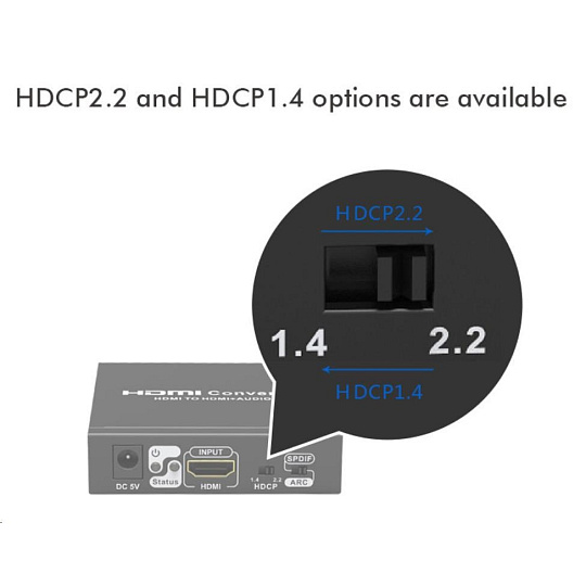 Umožní oddělit audio z HDMI2.0 vstupu na analogové / digitální audio, které je vyvedeno zvlášť na konektory: stereo jack, Digitální audio RCA CINCH nebo digitální optické TOSLINK (SPDIF)