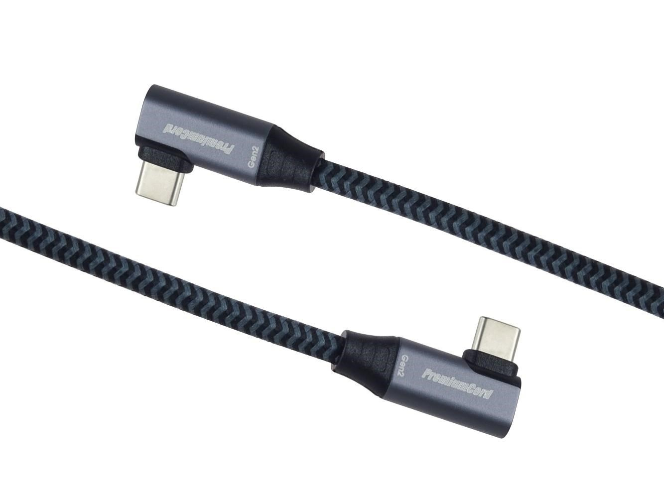 PremiumCord USB-C 2x zahnutý 90° kabel ( USB 3.2 GEN 2x2, 5A, 100W, 20Gbit/s ) hliníkové krytky konektorů, bavlněný oplet, 1m