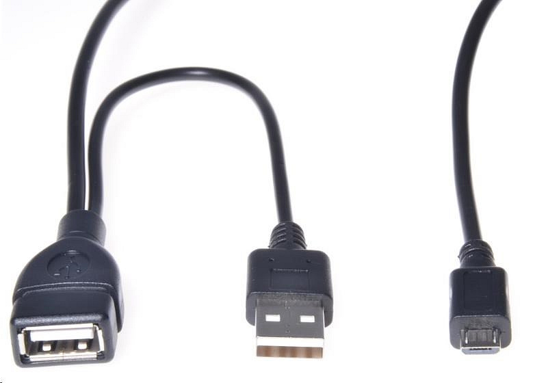 Tento kabel se zapojí konektorem Micro USB do chytrého telefonu, který podporuje funkci OTG. Do konektoru USB A/female se zapojí myš, flashdisk, externí disk, čtečky karet a další přenosná paměťová média. Konektor USB A/male se zapojí do USB nabíječky nebo počítače a umožňuje posílení napájení.