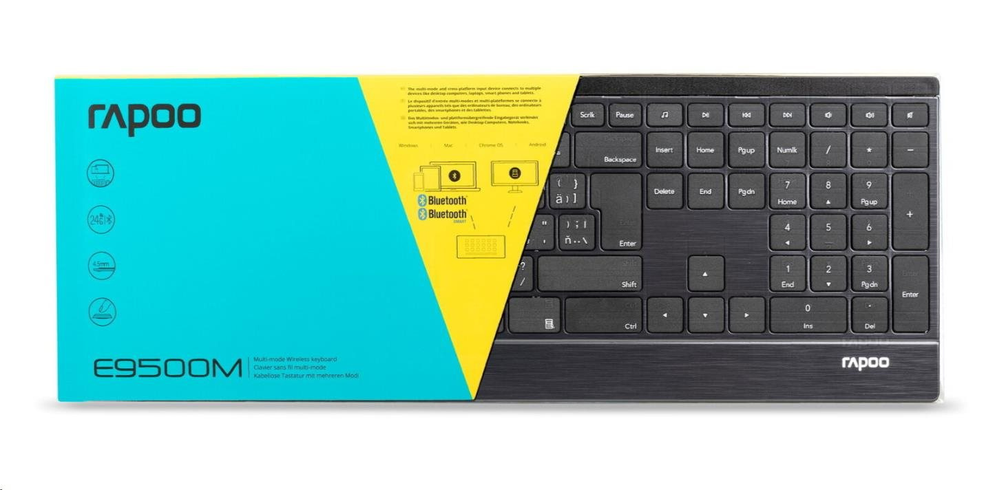 Tato ultratenká klávesnice spojuje prvotřídní materiály se stylovým designem. Tělo klávesnice vyrobené z nerezové oceli a hliníkové slitiny je nejen pevné a odolné, ale zároveň dodává pracovnímu stolu určitý styl. Klávesnice E9500M je nejen vyspělá konstrukcí, ale také funkcionalitou. Nabízí vícerežimovou technologii připojení firmy Rapoo – prostřednictvím spolehlivého bezdrátového vysílače 2,4 GHz, Bluetooth 3.0 a 4.1 – umožňuje současné připojení a přepnutí několika zařízení (s automatickým párováním). Navíc energeticky úsporná technologie firmy Rapoo zajišťuje životnost baterií až 12 měsíců, takže minimalizuje potřebu jejich výměny.