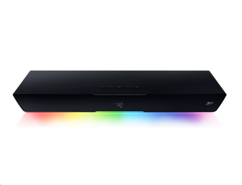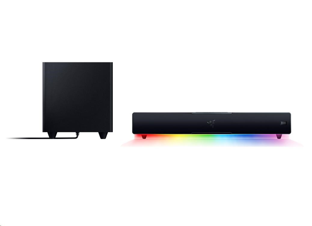| OTHERS | Razer Chroma™ RGB (18 zones) THX Spatial Audio (PC based via Synapse 3) Bluetooth 5.2 (60ms low latency) USB audio input Razer Audio app Razer Chroma RGB app Custom 10-band EQ Raised feet on soundbar Headphone quick toggle Dimensions: Soundbar: 19.7 x 3.6 x 3.3" / 500 x 91.3 x 84 mm Subwoofer: 8.67 x 8.67 x 9.5" / 220 x 220 x 241.5 mm |