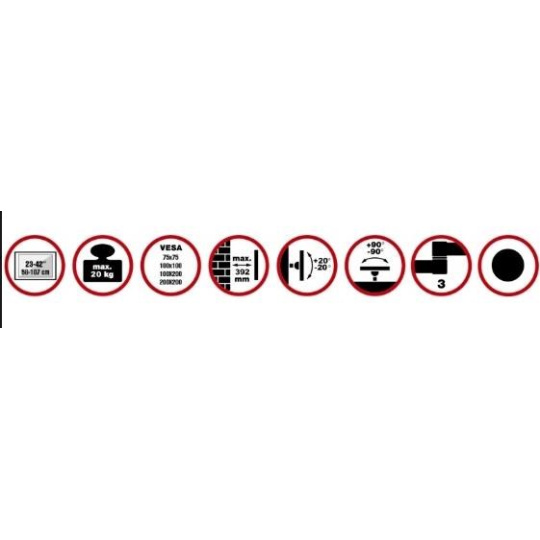 Nástěnný ocelový držák na LCD monitory a TV s uhlopříčkou 23"- 42" (58-107cm) a hmotností maximálně 20kg. 3x pant, vertikálně výklopný +20°/-20° a horizontálně otočný +90°/-90°, vzdálenost od stěny 82-392mm, materiál ocel, barva černá. Uchycení VESA: 75x75, 100x100, 100x200, 200x200..