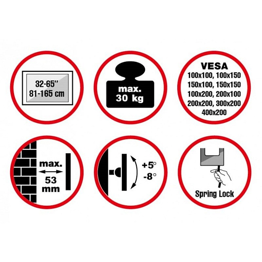 Nástěnný ocelový držák na OLED TV s uhlopříčkou 32"- 65" (81-165cm) a hmotností maximálně 30kg. Konzole na zavěšení TV s vodováhou, vertikálně výklopný +5°/-8°, vzdálenost od stěny 53mm, materiál hliník/ocel, zámek Spring Lock se šňůrou, měkká podložka, barva černá. Uchycení VESA: 100x100, 100x150, 150x150, 200x100, 200x200, 300x200, 400x200..